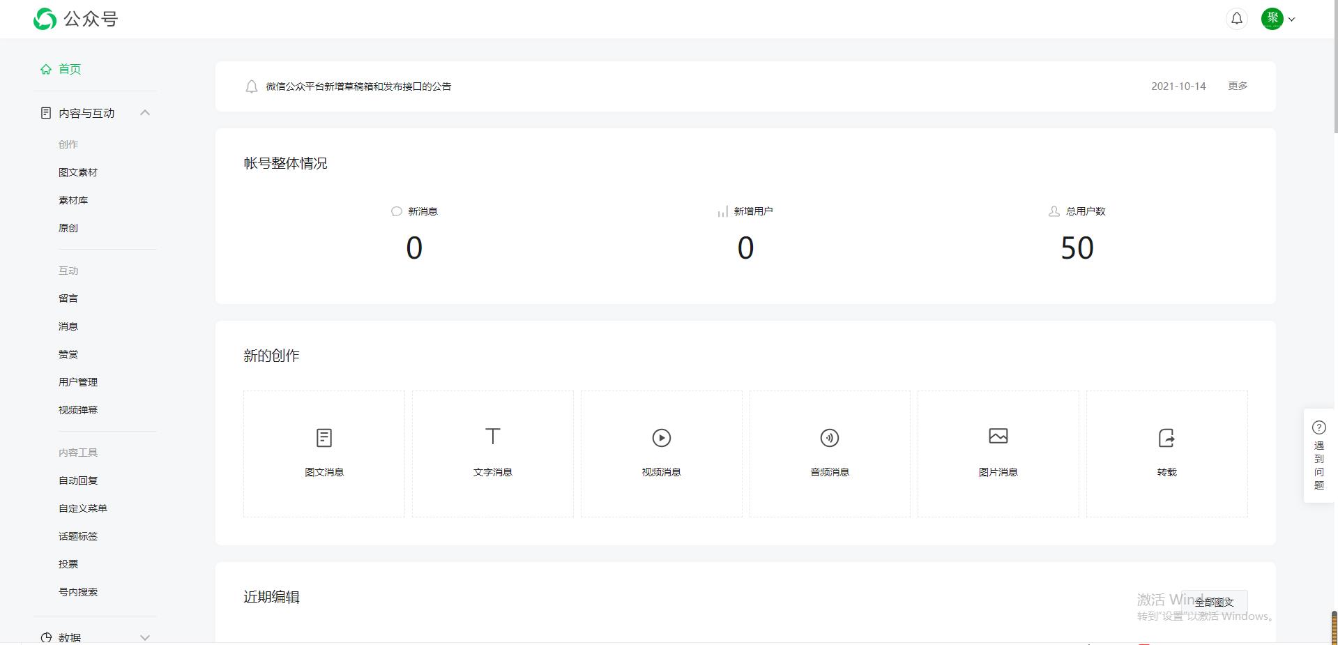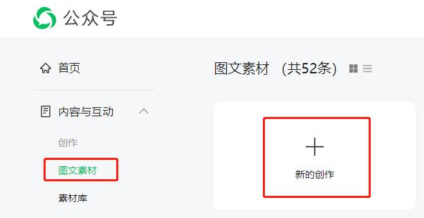 2,點(diǎn)擊左側(cè)的圖文素材,然后點(diǎn)擊新的創(chuàng)作。